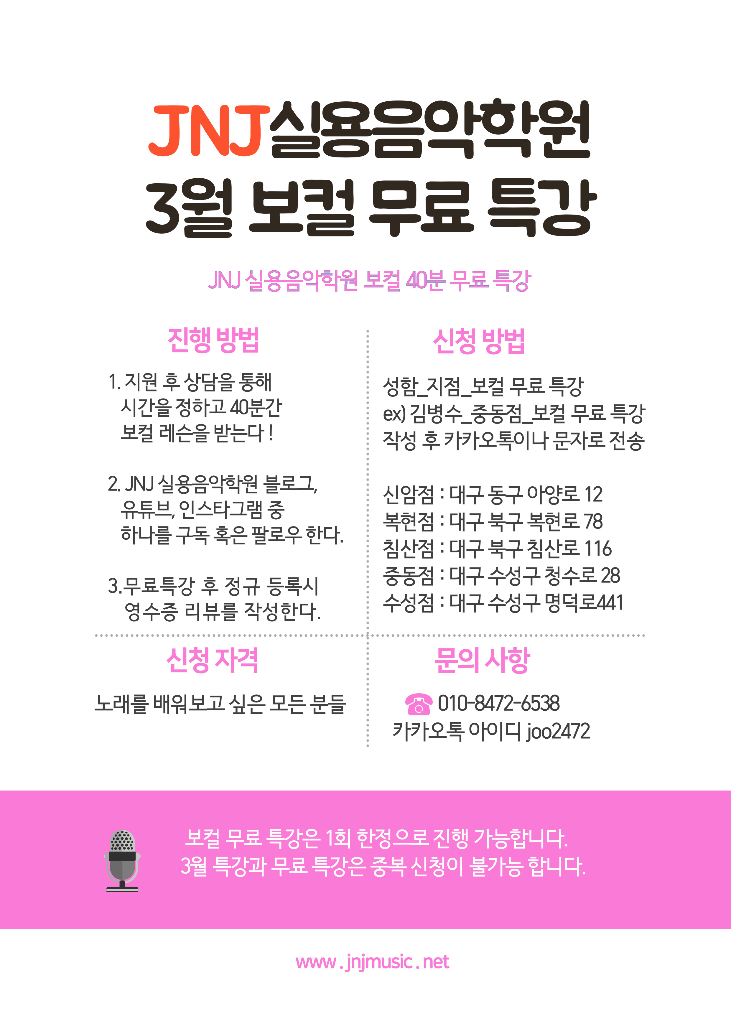 [공지사항] 3월 보컬 무료 특강 (신암 복현 침산 중동 수성)